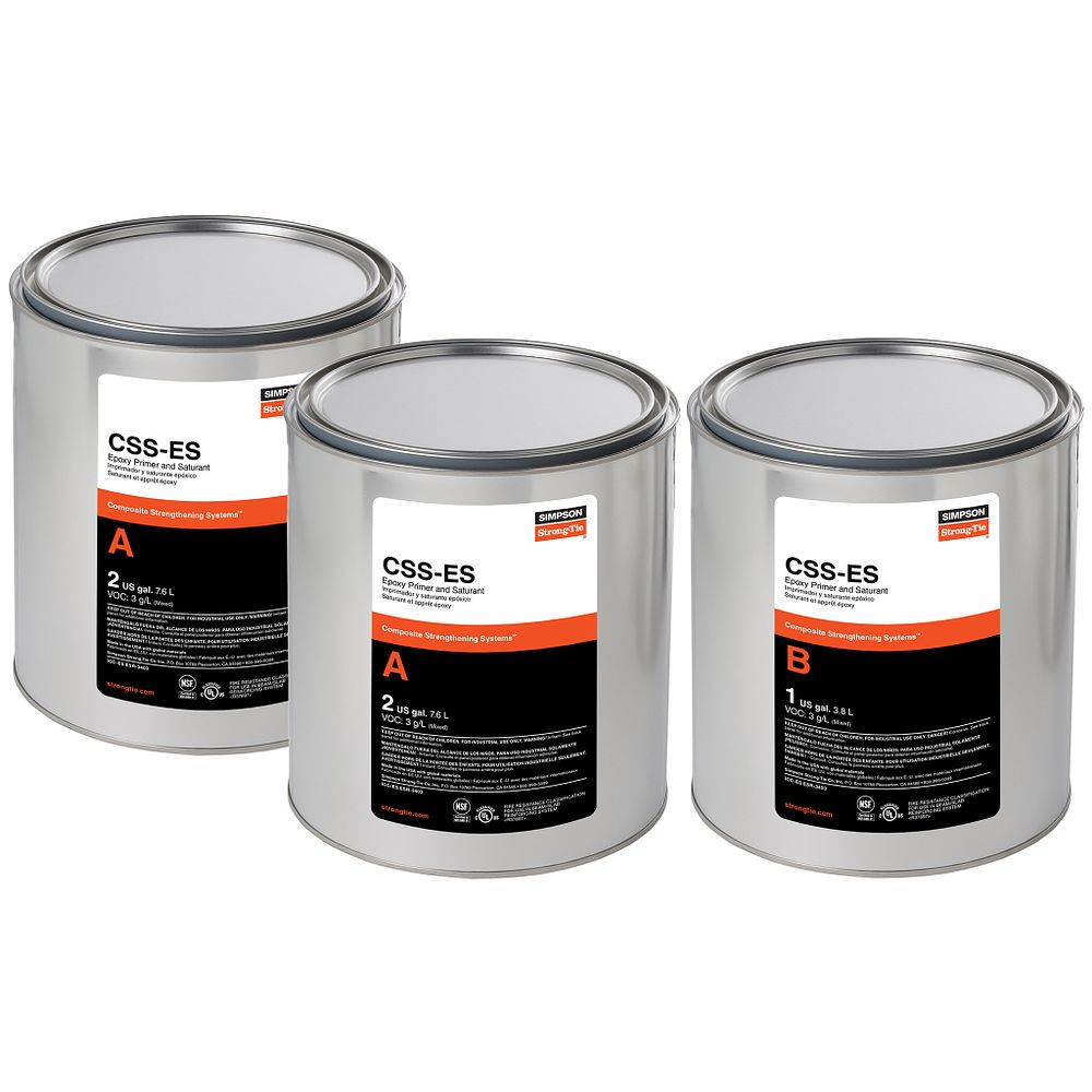 CSS-ES is a two-component, high-strength, high-modulus epoxy resin system used to prime substrates and saturate the Simpson Strong-Tie® Composite Strengthening Systems™ (CSS) fabrics. When extended with fumed silica, thickened CSS-ES is used as a high-performance substrate repair material and CSS finish coating. This product has been evaluated per ICC-ES AC125 for concrete and unreinforced masonry strengthening using externally bonded fiber-reinforced polymer (FRP) composite systems. This product is NSF-listed safe for potable water. Please refer to the NSF listing for the NSF 61–listed application. This product is part of the tested assembly in UL Design No. N861, which achieved a four-hour fire rating when subjected to ASTM E119 / UL 263 full-scale fire testing. Please refer to UL Online Certifications Directory for the UL listing.