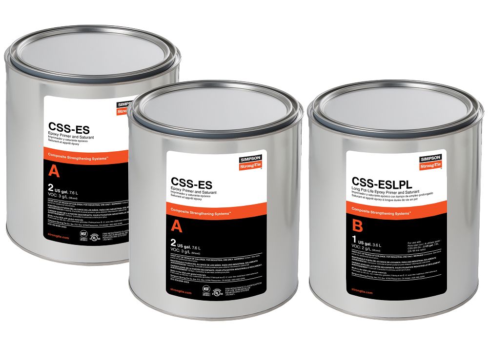 CSS-ESLPL is a two-component, long pot-life, high-strength, high-modulus epoxy resin system used to prime substrates and saturate the Simpson Strong-Tie® Composite Strengthening Systems (CSS) fabrics. When extended with fumed silica, thickened CSS-ESLPL is used as a high-performance substrate repair material and CSS finish coating. This product has been evaluated per ICC-ES AC125 for concrete and unreinforced masonry strengthening using externally bonded fiber-reinforced polymer (FRP) composite systems.