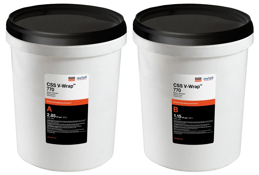 CSS V-Wrap 770 is a two-part, 100% solids epoxy for high-strength composite bonding applications. CSS V-Wrap 770 matrix material is combined with CSS V-Wrap carbon and glass fabrics to provide a wet-layup composite for strengthening of structural members. It is formulated to provide high elongation to optimize properties of the CSS V-Wrap composite systems. It provides a long working time for application, with no offensive odor. CSS V-Wrap 770 may be thickened with fumed silica to produce a tack coat/putty or a finishing coat, depending upon the project requirements. CSS V-Wrap 770 contains no volatile organic compounds (VOC) or solvents.